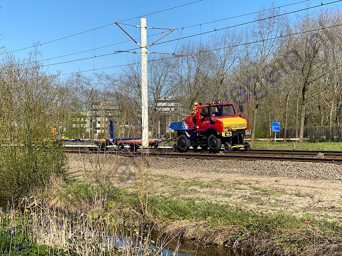 De stopmachine van Bam, deze zorgt dat de spoorstaaf waterpas ligt.